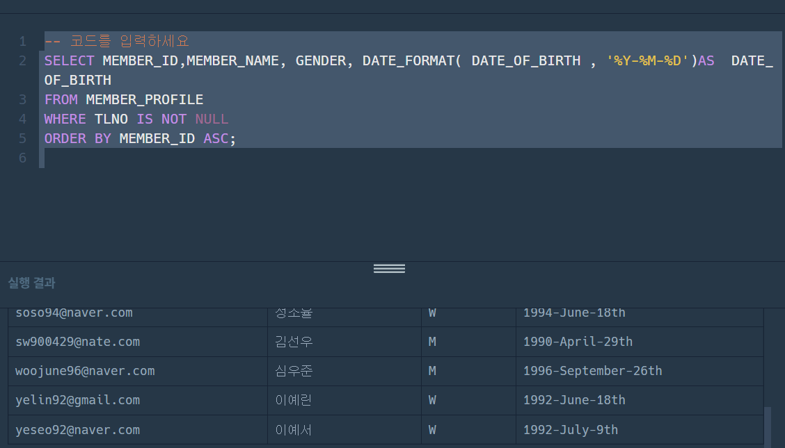 https://school.programmers.co.kr/learn/courses/30/lessons/131114 프로그래머스SW개발자를 위한 평가, 교육, 채용까지 Total Solution을 제공하는 개발자 성장을 위한 베이스캠프programmers.co.kr문제 FOOD_WAREHOUSE 테이블에서 경기도에 위치한 창고의 ID, 이름, 주소, 냉동시설 여부를 조회하는 SQL문을 작성해주세요. 이때 냉동시설 여부가 NULL인 경우, 'N'으로 출력시켜 주시고 결과는 창고 ID를 기준으로 오름차순 정렬해주세요정답 코드-- 경기도 위치-- NULL 이면 N-- ID 기준 오름 차순SELECT WAREHOUSE_ID, WAREHOUSE_NAME, ADDRESS ,COALESCE(FREEZER_YN ,'N..